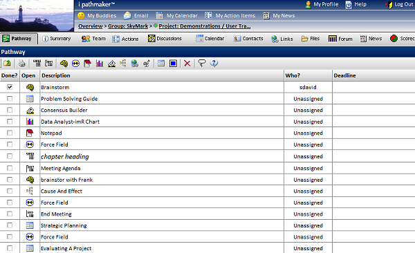 To enhance team communication, members of your group will be able to work together on projects and tools. Your team can have virtual meetings, hold free-for-all brainstorms, hold elections, and collaborate on other tools, all through ipathmaker.